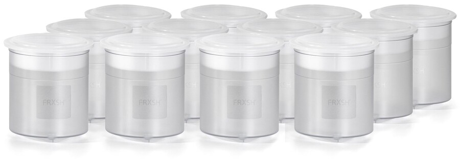 12 transparent FRXSH synthetic cups with caps for deep-freezing and processing of food recipes.¹